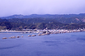 大島側から眺める眼下の橋杭岩もひと味ちがった趣があります。 |